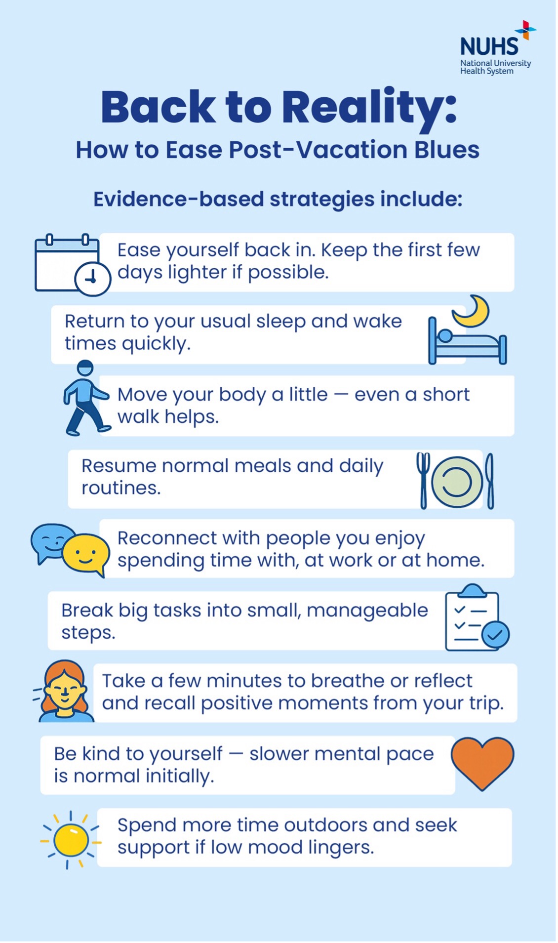 “This reaction surprises many people,” said Mr Loo Wee Shyon, Senior Clinical Psychologist at National University Polyclinics (NUP). “But post-vacation blues are not a sign that something went wrong. Instead, they’re a sign that your brain is adjusting back to your usual routine.”