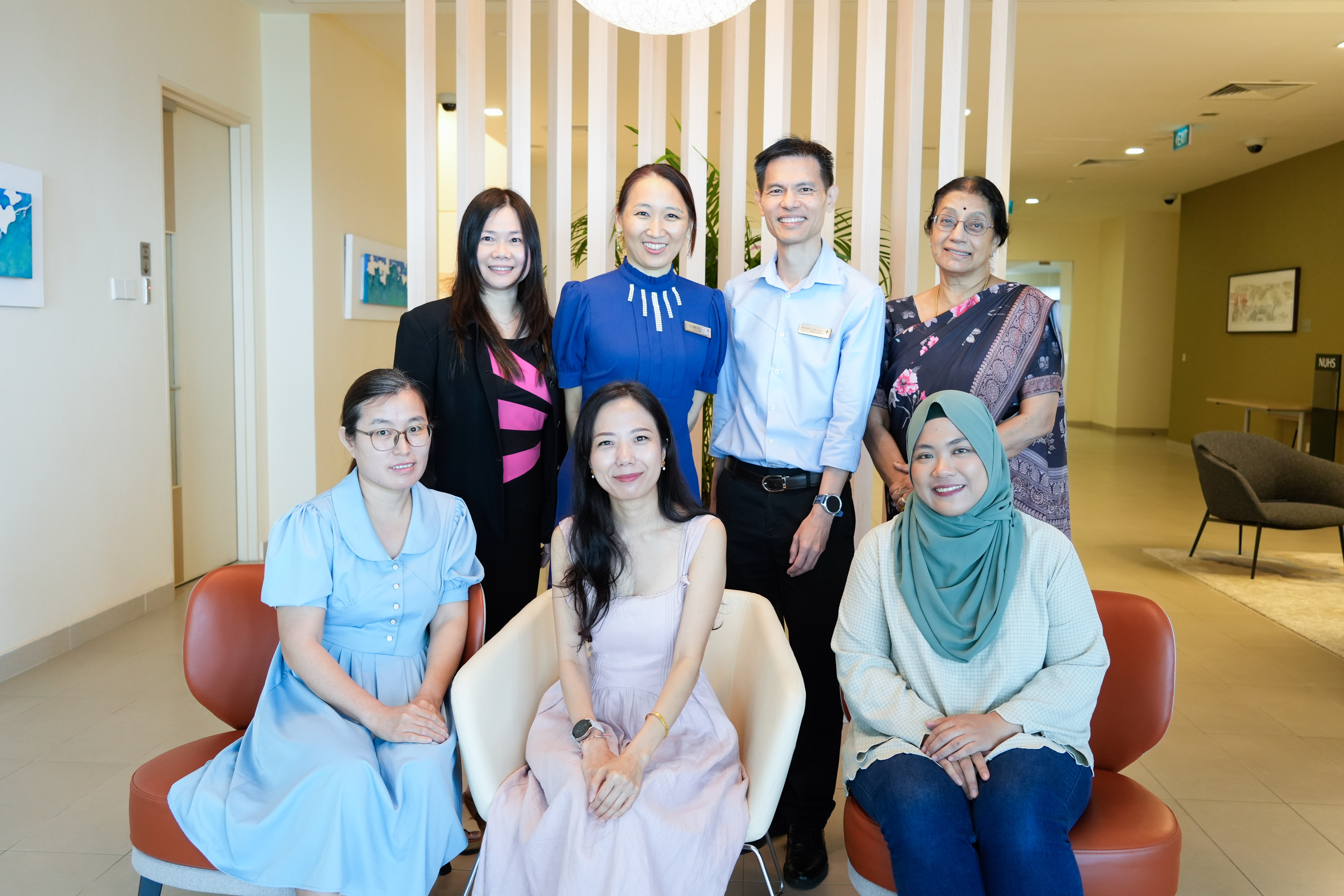 Patients Mdm Geng Yan Juan, Mdm Cheryl Goh and Mdm Nur’Huda Binte Kamsani (seated), who reversed their condition under NUH’s postpartum GDM service, with their care team including Dr Eng Pei Chia and Adj A/Prof Khoo Chin Meng (standing).