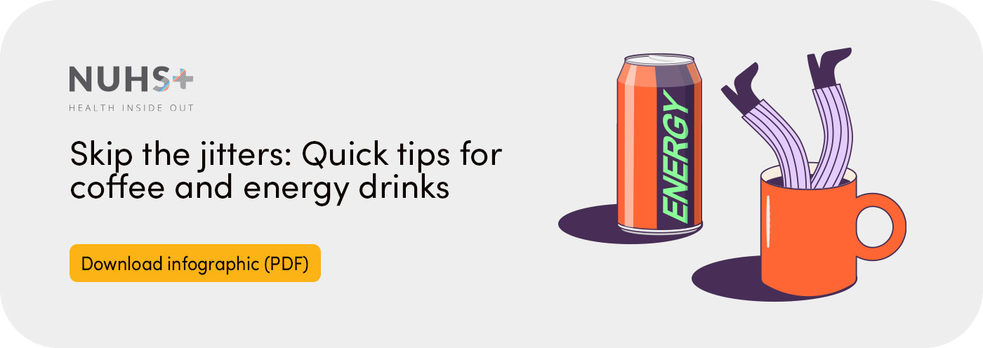 The same advice applies to energy drinks. They count towards your 400mg total. A single can may equal one or two cups of coffee, so it is easy to tip over your daily limit without realising it.